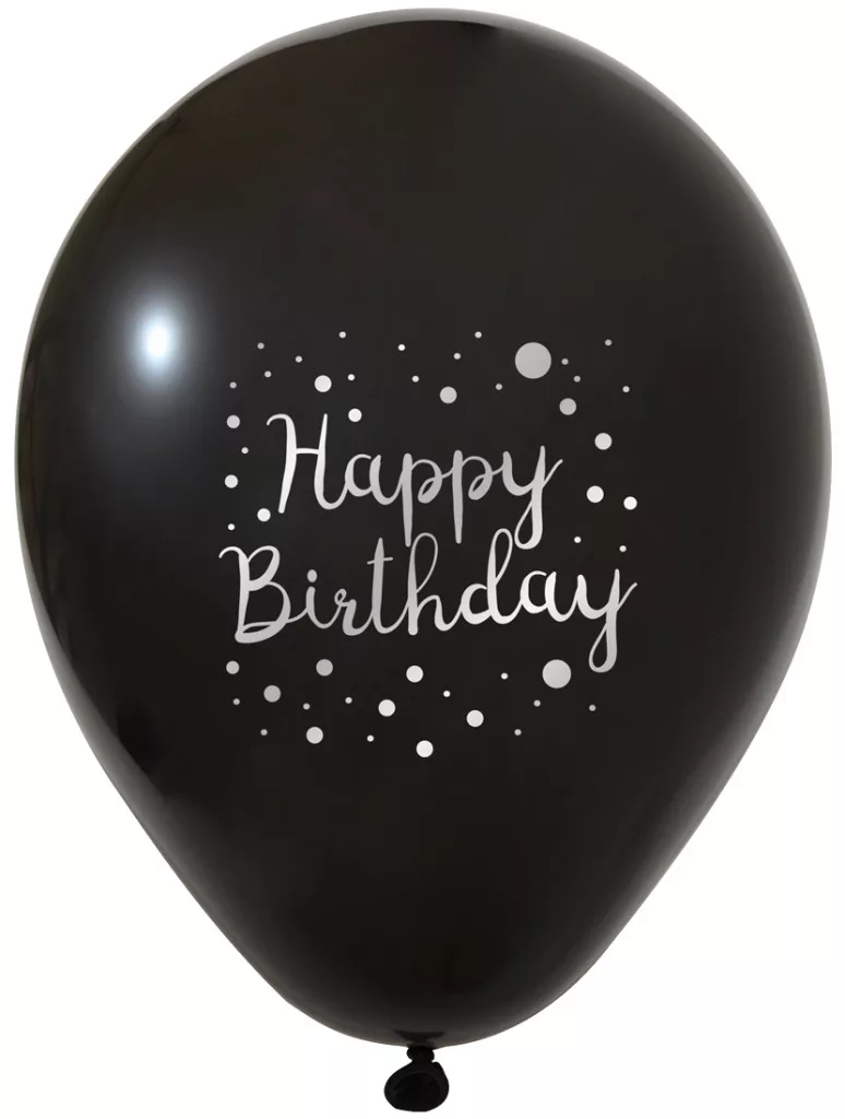 BALONEVI lufi, 12" 30cm, 50db/cs, Happy Birthday, Fekete Ezüst felirat